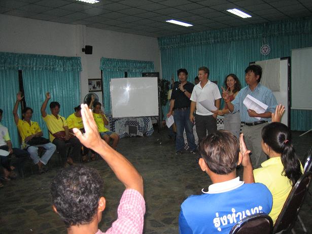 We introduce ourselves and ask a few questions. How many are rice farmers (about 10 of the 14), how many have another business (6: working in a call center, electronics repair, growing fruit, growing vegetables, raising fish and frogs), how many are in debt (all, including, at the moment, the authors). With this common bond, we hope that the lessons will help the villagers grow their businesses, get out of debt and be more prosperous.