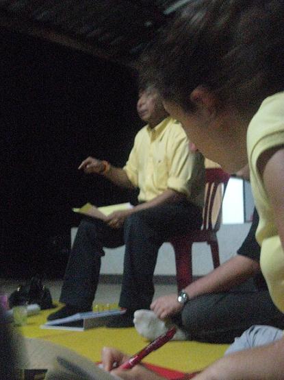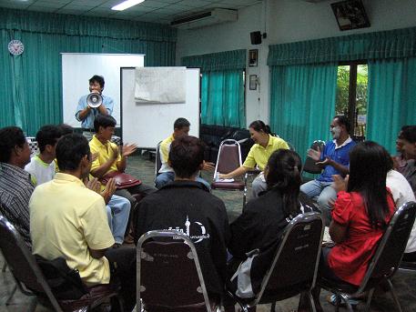 When all 14 students arrive, we begin a few ice-breaker exercises intended to relax the group, acclimate them to a new environment and create a sense of membership among this otherwise separate group of individuals. They go through introductions, play a hot-potato-like game (instead of moving, a bottle of baby powder is passed around, and when it stops, that person applies a handful of baby powder to his own face or that of someone else). They smile and laugh as if they met long before they walked through the door minutes earlier. As they finish, Khun Prahat, the elder professor for the evening, introduces the evening, the lesson and us.
