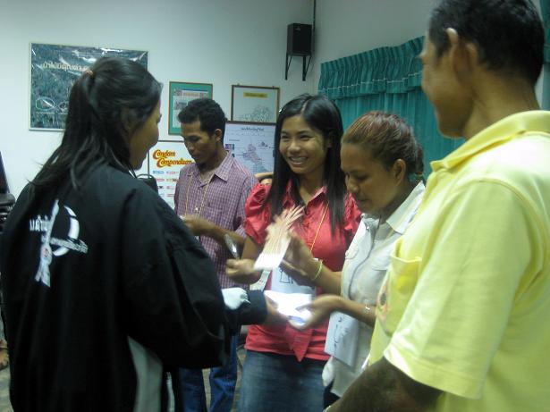 Just before we break for dinner, around 8 p.m., another representative of PDA changes the topic to something more serious. Recently, a young teenager accidentally became pregnant, the young father to-be denied responsibility and her family disowned her. She’s gone to Bangkok, and that’s the last anyone’s heard from her. The message here is that safe sex and condoms do more than prevent disease; they also keep families and communities from breaking apart. And, just as PDA provides the tools for the villagers to improve their financial lives, PDA also provides the tools for these villagers to improve their health. Amazingly, the staff members of PDA have built up enough trust with these villagers that few are turned off by talk of safe sex and condoms.