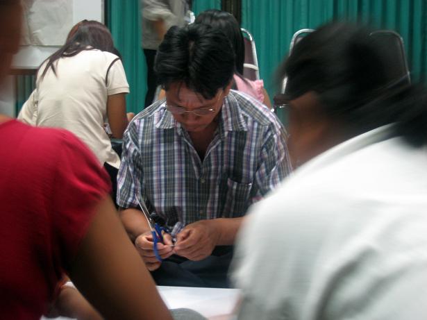 Khun Tom introduces the next simulation. This one involves making and selling a product, bamboo baskets from strips of paper cut to mimic bamboo rods. He enthusiastically divides the group into three teams: one group of five customers who each will assume preferences and a budget, and two teams of five who will interview the customers, decide what to make and make it – all in 15 minutes. The production teams then will try to sell each product to the customers, who may buy the product from whoever met their needs. If the product doesn’t meet a particular customer’s needs, he may refuse to buy anything.