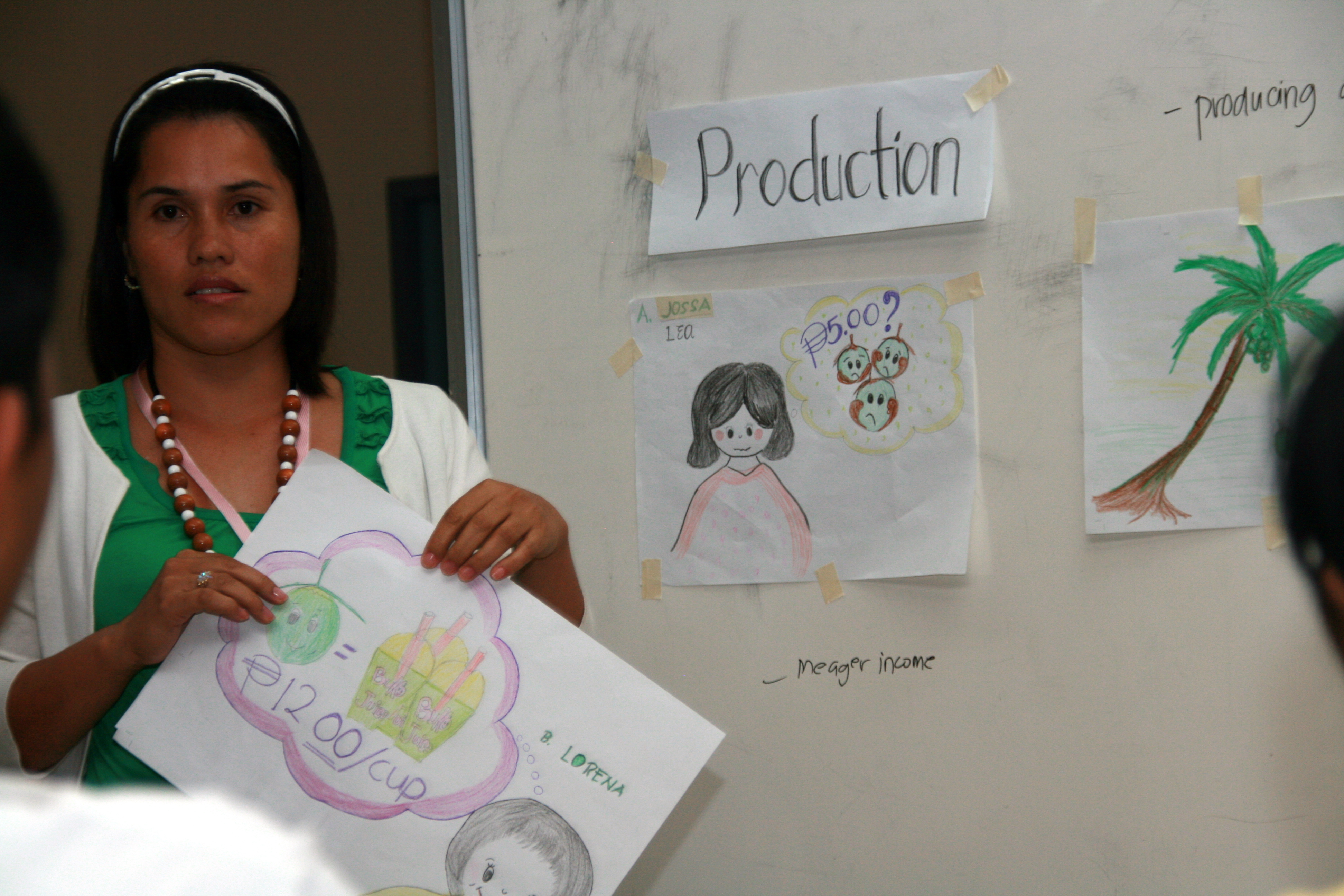 As a group we adapted three sample lessons: saving, investing and spending. We replaced Thai names, items and prices with blanks. We then filled in the blanks one by one, Madlib style. Participants were comfortable adapting the stories by lunchtime and spent the afternoon working in groups of two or three to adapt the remaining stories to local specifications. By the end of the day, each small group had adapted three to five stories, and collectively we completed two full Philippine adaptations and made significant headway on several more.